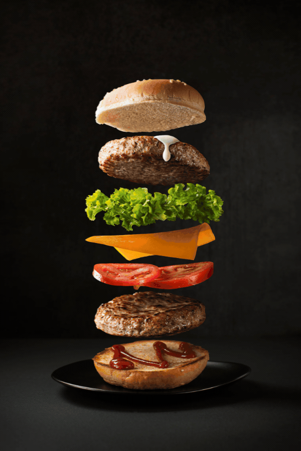 Pão de hambúrguer Grande, cheddar, fatias de bacon, 2 hambúrgueres, queijo prato, ketchup e maionese.